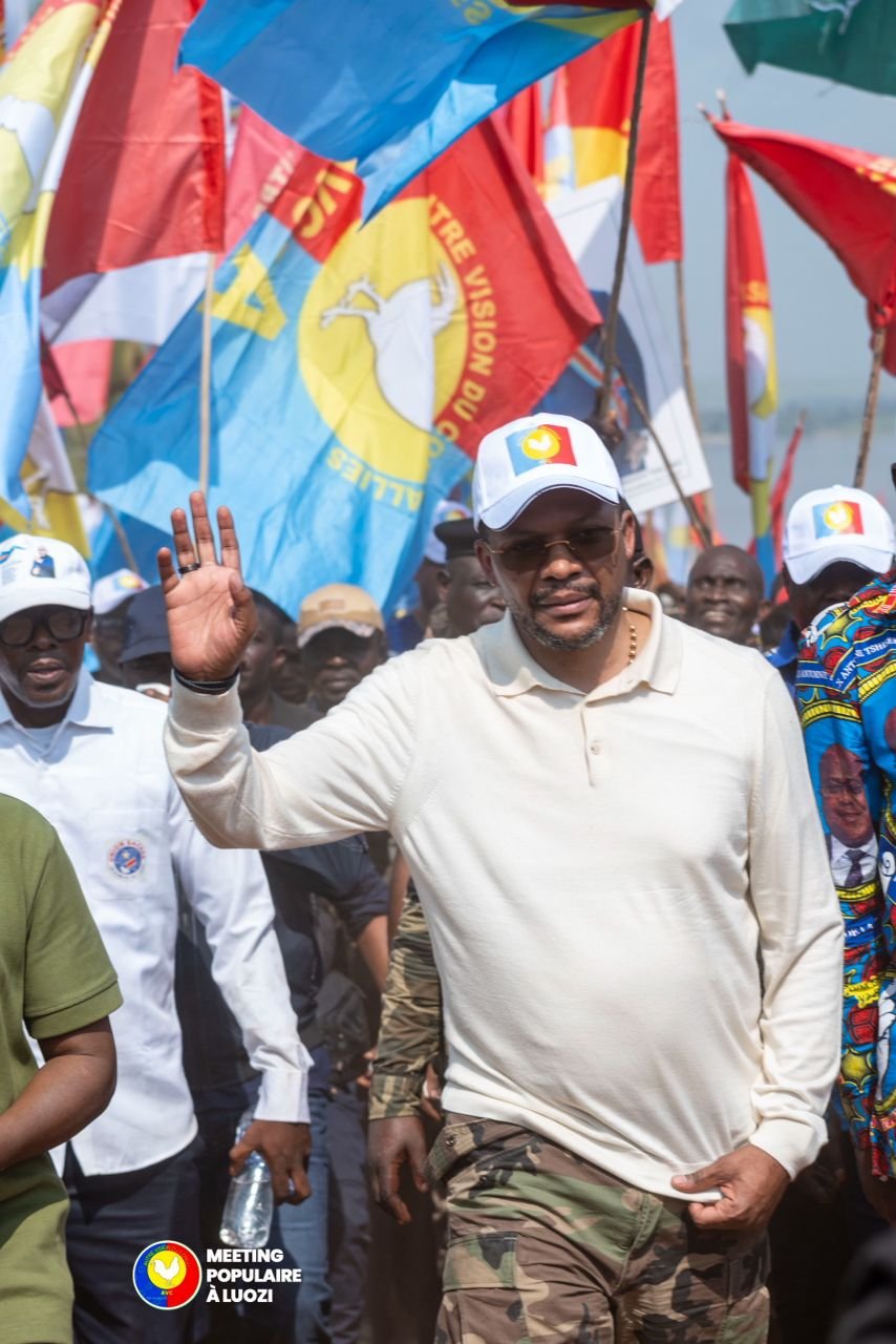 À son arrivée au beach de Luozi, une foule nombreuse l’attendait pour un véritable bain de foule. Accompagné du gouverneur du Kongo Central, Grâce Bilolo, ainsi que de plusieurs députés nationaux et cadres du parti AVC, il a été escorté par la population jusqu’au stade Bidimio où s’est tenu le meeting populaire.
