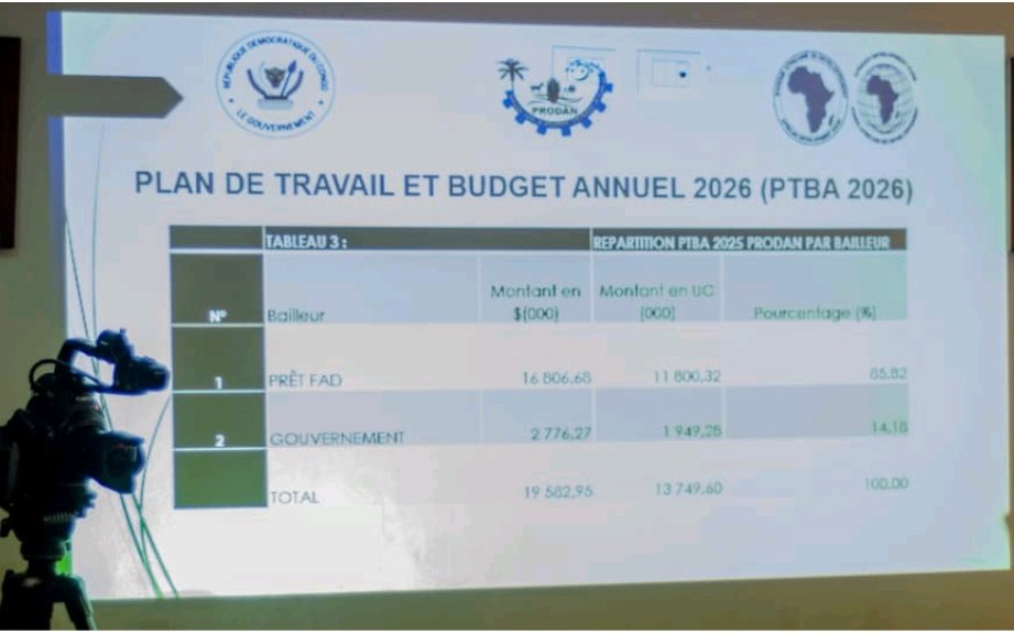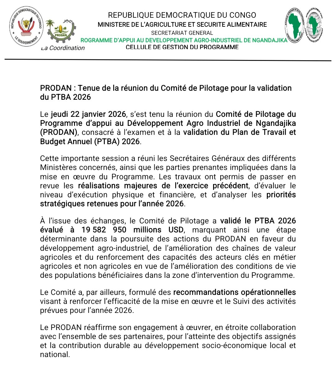 Le jeudi 22 janvier 2026, s’est tenu la réunion du Comité de Pilotage du Programme d’appui au Développement AgroIndustriel de Ngandajika (PRODAN), consacré à l’examen et à la validation du Plan de Travail et Budget Annuel (PTBA) 2026.